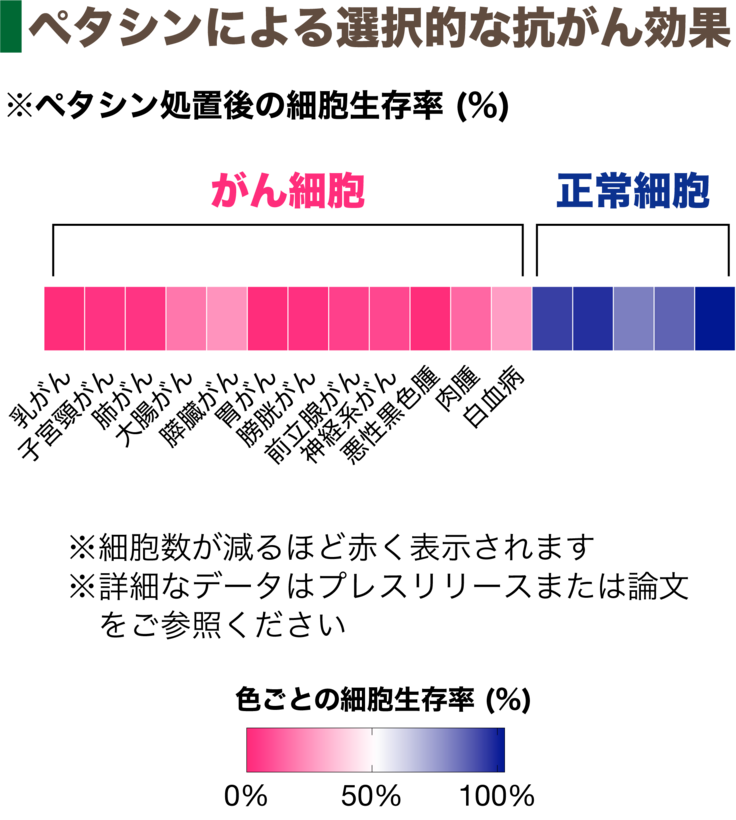 また、もう一つの特徴として、ペタシンはほとんどのタイプの腫瘍細胞に強い抗がん活性を示しました。これは、有効な腫瘍のタイプが限られている一般的な抗がん剤とは全く異なる特徴です。