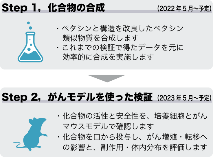 実際の計画としては、Step 1 化合物の合成と、Step 2 がんモデルを使った検証を実施したいと考えています。