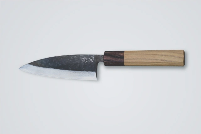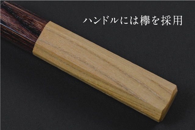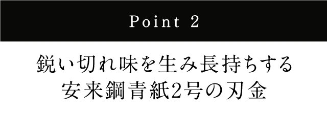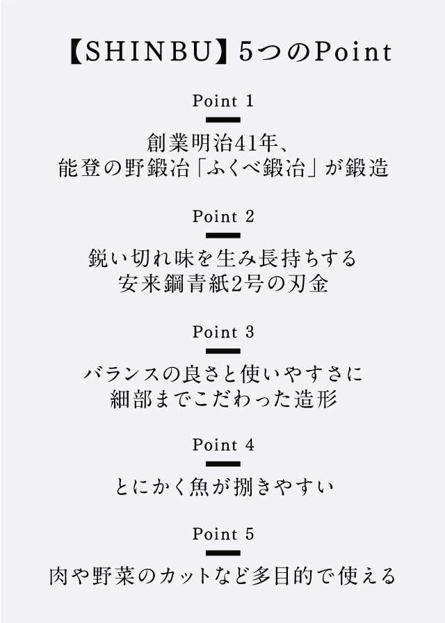 万能出刃包丁として硬い骨のある魚をはじめ様々な食材を扱う【SHINBU】では、刃金に鋭い切れ味が長期間持続する青紙2号を採用しました。
