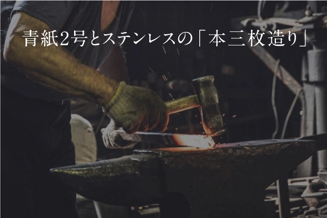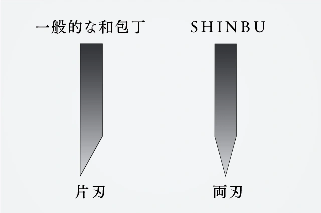 【SHINBU】は日本刀を作る技術を応用した鋼となる安来鋼青紙2号(以下、青紙2号)を地金のステンレスで挟み込んだ「本三枚造り」です。