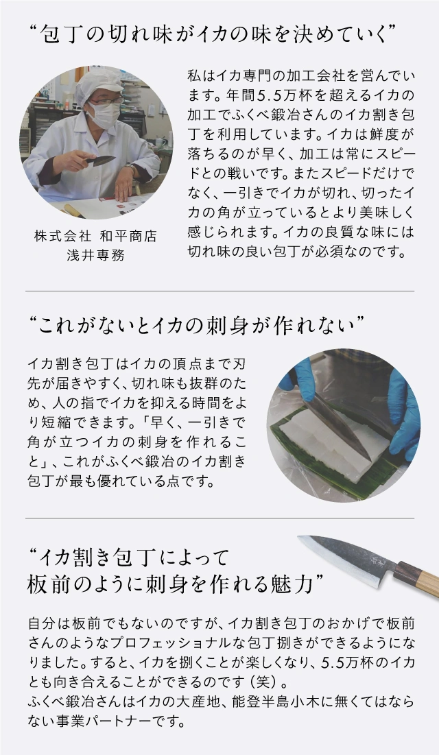 【SHINBU】の基となった「イカ割き包丁」も、日本有数のイカの漁獲量を誇る能登の漁師がイカを素早く捌くため様々な工夫が凝らされています。
