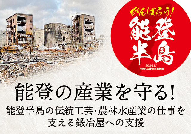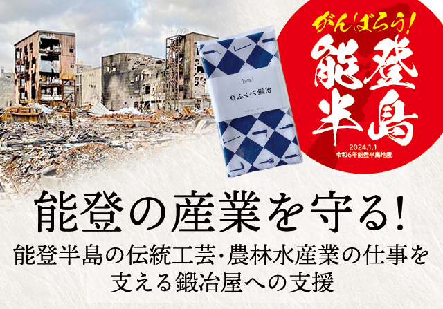 能登には様々な伝統工芸や農林水産業を営んでいる事業者がいます。その現場は手仕事が多く、道具無くしては成り立ちません。私達鍛冶屋は、そうした道具を救い、産業を支える職人さん達に、道具を通じて前向きな気持ちになってもらう役割を果たしていけたらと考えています。その為には、安定し継続した仕事が不可欠です。弊社の包丁やポチスパ(包丁研ぎ宅配サービス)などのご注文(ご支援)をいただくことで、鍛冶職人達の仕事が確保され、能登の産業を支える役割が安定して担えるものだと考えています。是非、能登に安定した産業を継続させていくためにもご支援をよろしくお願いいたします。