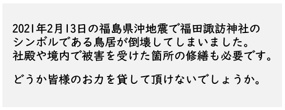 10年前の東日本大震災において鳥居が崩壊し再建したところで、今回、再び別の鳥居が被災し崩落しました。崩落してしまった鳥居の姿をみるに、また、あの時と同じくなんとも悲しく残念な気持ちでいっぱいであります。当社の歴史を振り返れば、これまで幾度も天災に見舞われては再興して今日に至っております。「神様は自ら助ける者を助ける。」と言われます。 どうか皆様のご支援をいただきまして、鳥居の再建を成し遂げたいと考えておりますので、何卒お力添えの程、宜しくお願い致します。