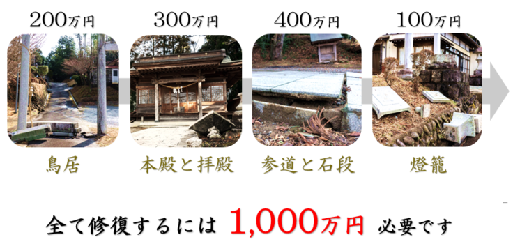 今回の被災箇所を全て復旧するには総額1000万円ほどかかる計画です。そのうち、鳥居の再建と石段の修繕は保険適応外となっており、資金が足りていない状況です。