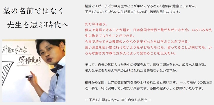情報は先に知るべし、未来の子どものためにいろんな知識をもって楽しく学び、選択肢を広げられる塾でありたい。首都圏は約4人に1人(※1)が中学受験をして、小学3年生から塾に通い始める割合が多い教育状況(※2)となっているといわれています。かつ子供が少なくなっている背景で、中学受験をする子どもたちが増えています。中高一貫校が増えている中、小学生のうちのみ全国での立ち位置がわかります。理由は有名私立大学の附属校、大学受験を目指す中高一貫校に入るために小学生たちが受験するためです。今、福井でも高志、福大附属を筆頭に中学受験がもっと盛り上がっていくと考えています。その背景から、中学受験の勉強を実際に福井でも行っていき、将来選択肢を広げられる子どもたちのお手伝いをさせていただきたく存じます。若い経営者と言われるかもしれません。しかしながら、十分の経験と実績を積んできております。初めは小規模な塾から始めますが、福井を代表する塾として将来を見据えて、皆様と共に盛り上げていきたいと思います。よろしくお願いいたします。