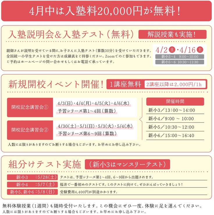 【開校記念割引 1か月授業料半額(新小3)※算数】