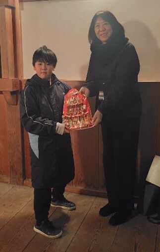 今回、申込の第1号を記念して、12月13日に、福井城址石垣ライトアップ点灯式を行いました。点灯前には委員会の事務局長から、加藤君に、福井城下歴史手帳(福井城址周辺のガイドブック)や缶バッチなどの記念品が贈られました。
