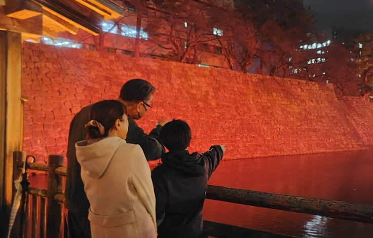 加藤君が点灯スイッチを押すと、石垣が赤や青など指定通りの11色に染まりました。
