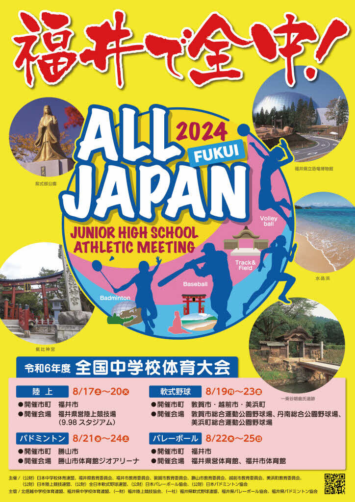 私たち「全国中学校体育大会福井県実行委員会」は、令和6年8月に北信越ブロックで開催される全国中学校体育大会全16競技のうち、福井県で開催される陸上・軟式野球・バレーボール・バドミントンの4競技大会を成功させるために組織されています。福井県中学校体育連盟を中心にして、県や開催市町および関係機関、競技団体等との連携を密にしながら、必要な準備や企画・運営にあたることを目的として開催前年の令和5年度に設立され、いよいよ本番の年を迎えることになりました。