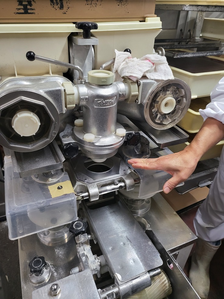 中には豚まん(肉まん)やシュウマイなどにも使う餡を皮で包む機械なども見せていただき、まさに今後の自分たちの課題となる勉強が出来ました!