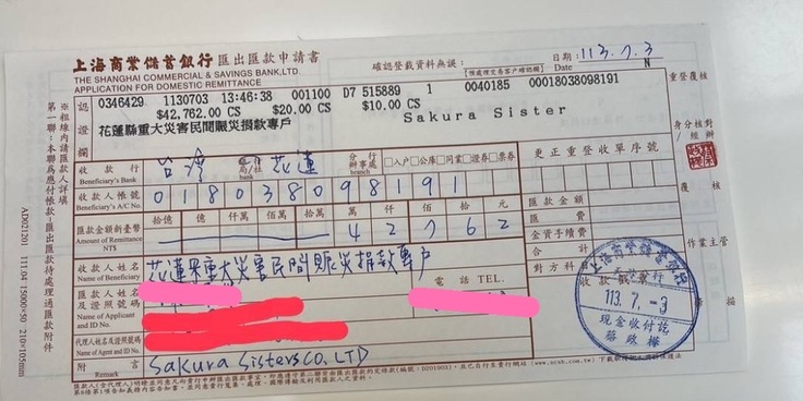 花蓮政府への義援金送金とリターン進捗についてのご報告。サクラ・シスターズ峯岸