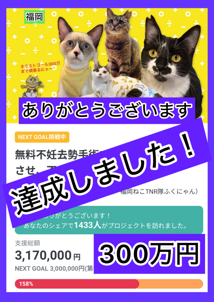 皆様の暖かいご支援により、ネクストゴール300万円を達成させて頂くことが出来ました。