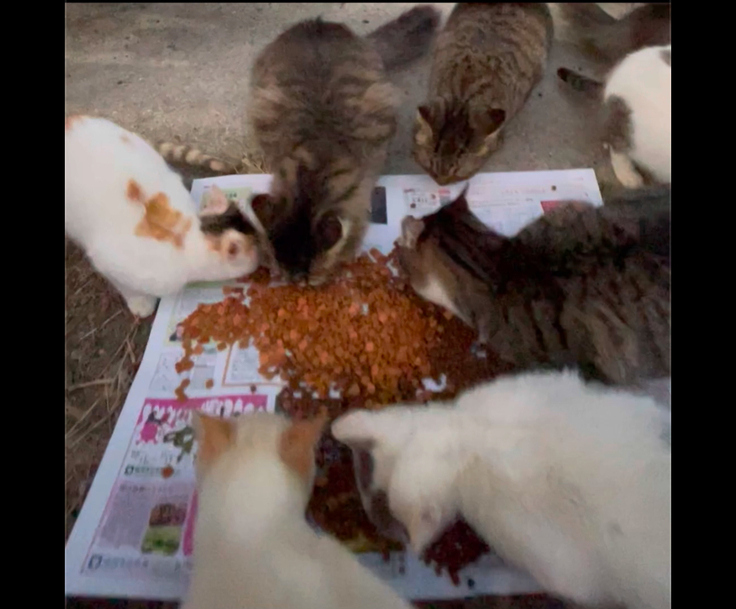 ビビリの猫たちは去って行きましたが、比較的人慣れしている子たちは足元でご飯を食べていました。