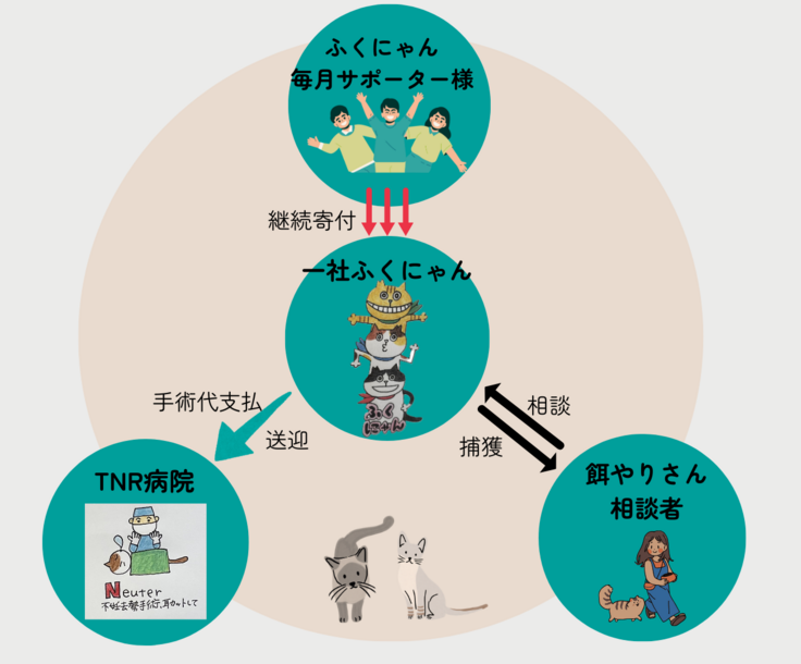 毎月定額のご寄付で、猫の不妊去勢手術を支えていただく仕組みです。