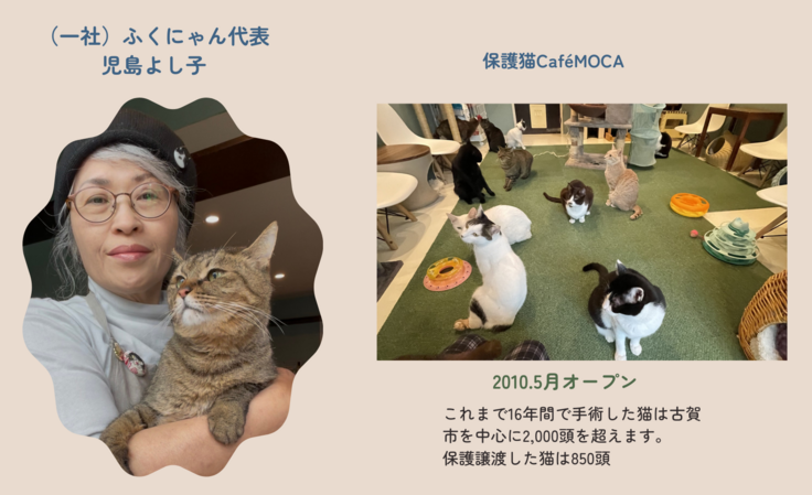 『一社ふくにゃん』の代表理事を務める私は、団体設立前の16年間「保護猫Café MOCA」を経営しながらボランティア「Kogaねこ」として飼い主のいない猫のTNRや地域猫活動のサポート、多頭飼育崩壊などたくさんの案件に携わり、 古賀市から殺処分される猫を0にしたい!を合言葉にメンバーと共に走り続けてきました。