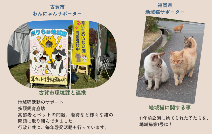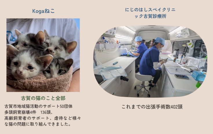 団体を立ち上げて1年、これまで454頭の避妊去勢手術を行いました。16年前より個人で活動をはじめ、2年後保護猫CaféMOCAをオープン。Kogaねことして古賀市内外を中心に2,000頭の不妊手術をしてきました。保護した頭数は850頭 地域猫活動のサポート50団体、多頭飼育崩壊4件136頭、高齢者とペットの問題、虐待など様々な猫の問題に取り組んでいます。