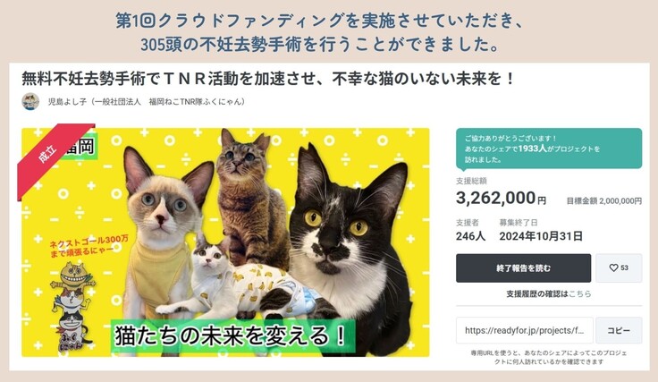 プロジェクトを応援してくださる方が増えて、一頭でも多くの猫に不妊去勢手術を受けさせられる事を願っています。