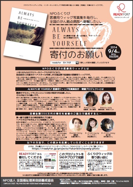 「医療用ウィッグ写真集を発行し、がん拠点病院へ寄贈したい」プロジェクトのNPOふくりび岩岡です。