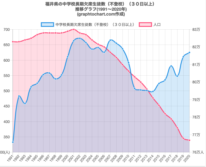 GraphToChart. 「グラフで見る福井県の中学校長期欠席生徒数(不登校)(30日以上)は多い?少い?(推移グラフと比較)」. 最終更新:2023-04-16.