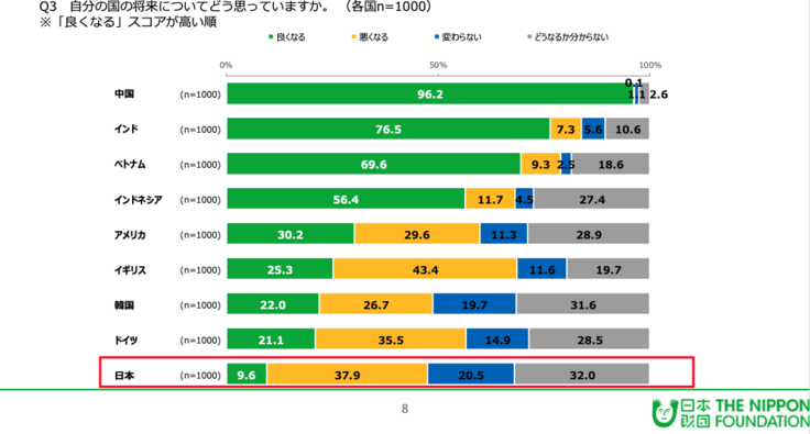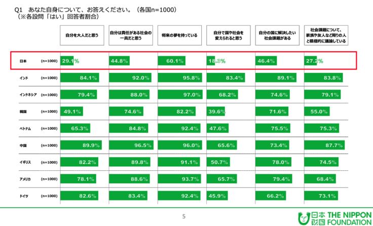日本財団が2019年に9カ国を対象に行った18歳意識調査では、
