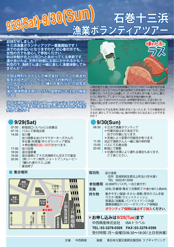 さらに、協力企業ソーケングループ社制作のショートアニメ「嫌われ者のラス」の上映会を実施します。海の環境問題を考える作品で、石巻の漁師さんたちやラブギャザも少しですが制作協力しました。