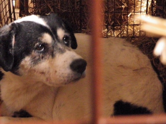 (疲れ切った目をした、捕獲器に入ってくれた犬)