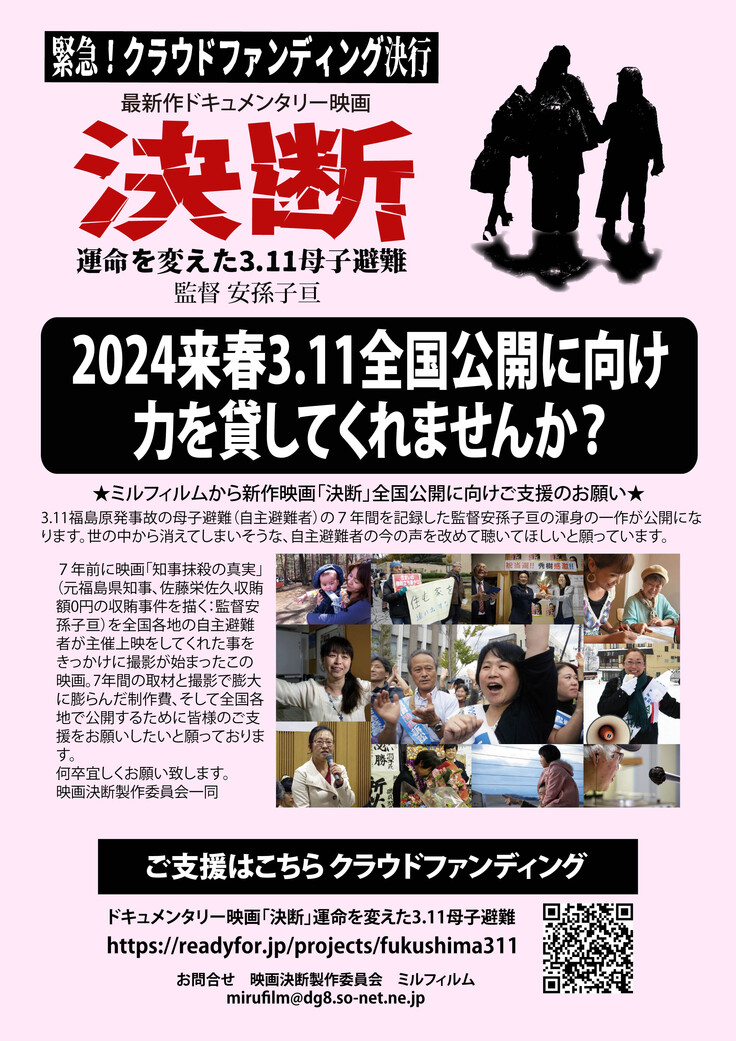 昨今、「東日本大震災3.11自主避難者」というワードは、様々なメディアで聞かれなくなった存在となっています。しかし、現在でも多くの自主避難者が様々な境遇の中闘っていることを知って頂きたい。当人たちが「決断」に至った根本のひとつは「福島原発事故の放射能汚染」です。当時、逃げるべきか、逃げなくてもいいのか、ではない。それだけの「死活問題」を起こし「恐怖」を国民に与えた現実は、紛れもない事実なのです。この映画はその放射能から子供を守りたいという一心で全国に散った母子避難の家族の叫びです。どうぞご支援宜しくお願い致します。
