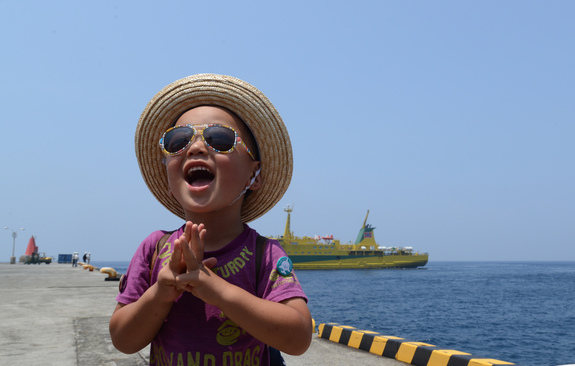 そして次の日、まだ海は荒れていましたが、前日より落ち着いていて、午前にちびっ子チーム出発。出てすぐにイルカと遭遇。ライフジャケット装着してスタッフと母親と一緒に海へとドボン。イルカ達はみんなに近づいてきてその姿を青い海の中で見せてくれたのです。そして優雅にみんなの周りをゆっくりと泳いでくれました。その日の午後も、イルカはその姿を見せてくれて参加者全員イルカと対面することができました!イルカに負けない満面の笑顔の子供たち。