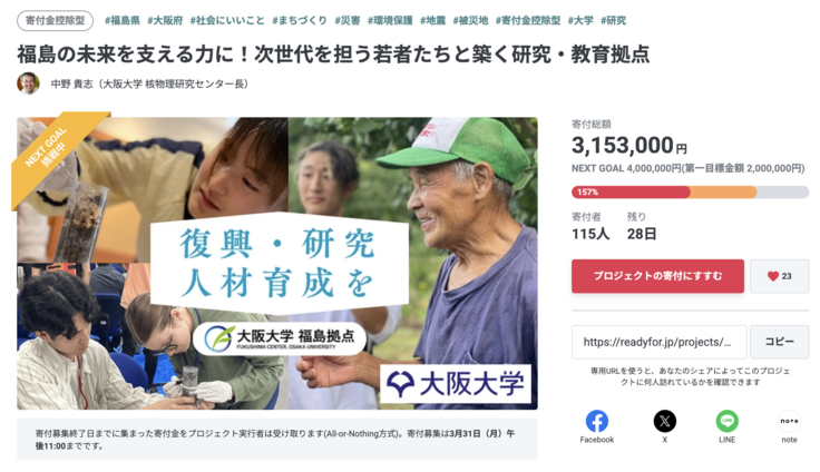 「福島の未来を支える力に!次世代を担う若者たちと築く研究・教育拠点」のクラウドファンディングを応援いただいております皆様、いつもたくさんの激励をいただきまして、誠にありがとうございます。