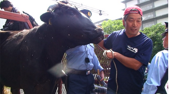 (浪江町の希望の牧場の被曝牛と牧場長の吉沢正巳さん)