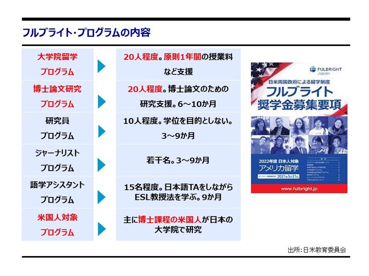 フルブライト奨学金制度は主に大学院レベル(修士・博士)での留学を目的とする他、ジャーナリストや英語教員向けプログラムなど多岐にわたっています。また、日本人の米国留学のみならず、米国学生の日本留学も支援しており、双方向性が大きな特徴の一つとなっています。