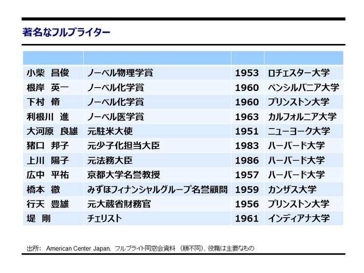現在までに、前身のガリオア・プログラムを含めフルブライト・プログラムで米国に留学した日本人は約 8,700名、米国からの留学生は約2,900名、合計約11,600名に上ります。日本人ノーベル賞受賞者4人、日本に留学した米国人ノーベル賞受賞者2人を含め、政治、経済、外交、ビジネス、アカデミア、芸術、ジャーナリズムなどの分野で多くの指導的な人材を輩出してきました。