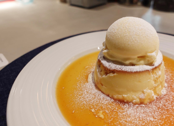 当店のアマレットティラミスをベースに作ったプリンの上にはアマレットリキュールを加えて作ったバニラアイスクリームを乗せています。