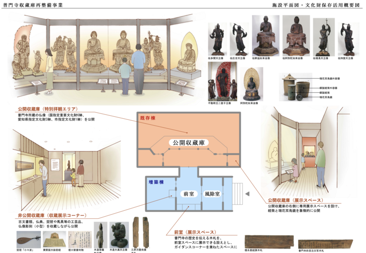 改修後は常時拝観可能な公開活用型の収蔵庫とし、鑑賞性向上のため展示台や解説パネル、展示照明などの展示設備を一新します。また、自然災害や人的被害から文化財を守るため、免震装置や防火・防犯設備を導入します。