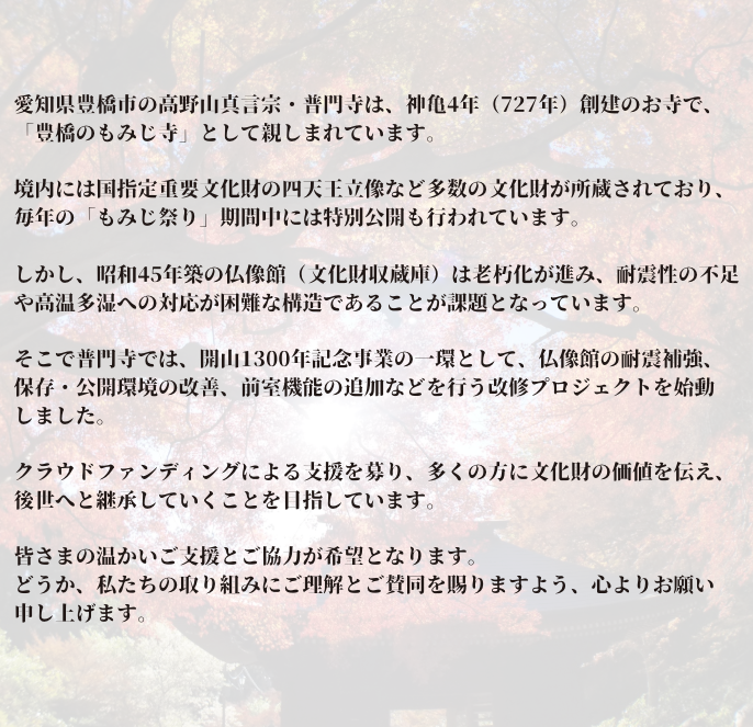 一千年の長きにわたって、東三河の方々はもとより、東海道を往来する旅人の祈りも見守り続けてきた普門寺の仏像の住まいとなる仏像館の改修を、ご支援くださいますようお願いいたします。