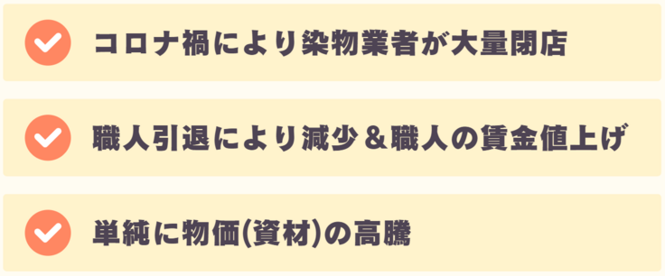 値上がりの理由は下記の通り。職人の減少が最も痛く、埼玉や神奈川でも業者を探しましたが、より高額か、請け負ってすらいただけない状況でした。さらに工場も問屋も店舗も口を揃えたのが「今が一番安い。刻一刻と値段は上がる」。もはや安くなるまで待とう、なんていう考えはあり得ないようです。