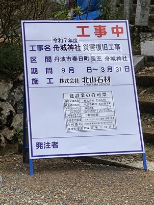 11年前の丹波市豪雨災害時に舟城神社の参道の一部が崩壊し、以来氏子様にご理解ご協力を呼び掛けて修繕積立費の増額も行い積み立てて参りましたが、少子高齢化また昨今の物価上昇などの影響もあり工事費用の全ては積み立っていない状況でした。