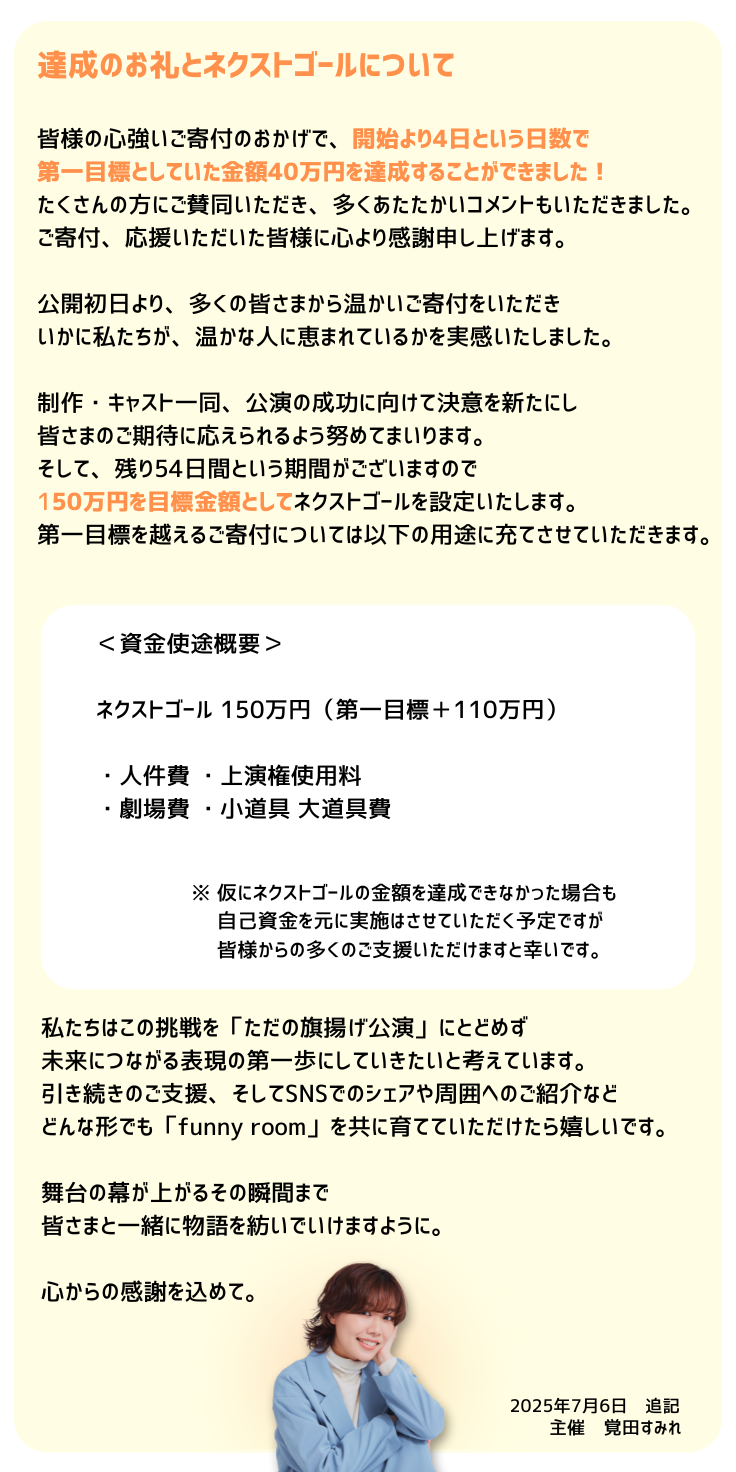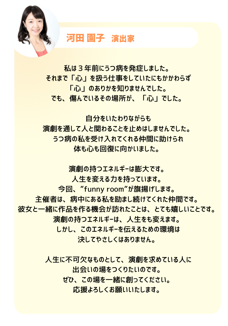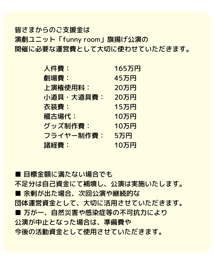 三重県から上京した姉妹で立ち上げた演劇ユニット「funny room」の旗揚げ公演。 私たちにとって、大きなチャレンジですが、今後の活動につながる一歩を実現するため、クラウドファンディングに挑戦することにしました。また、この場をきっかけにより多くの方に私たちの活動を知っていただき、演劇を広げられることを願って。 ご支援いただいた大切な資金は、事前準備費用・会場設営費・グッズ/フライヤー制作費・稽古場代・衣装費用など演劇の運営費に使用いたします。 尚、余剰分の支援金につきましては、今後のfunny roomの活動費に充てさせていただきます。