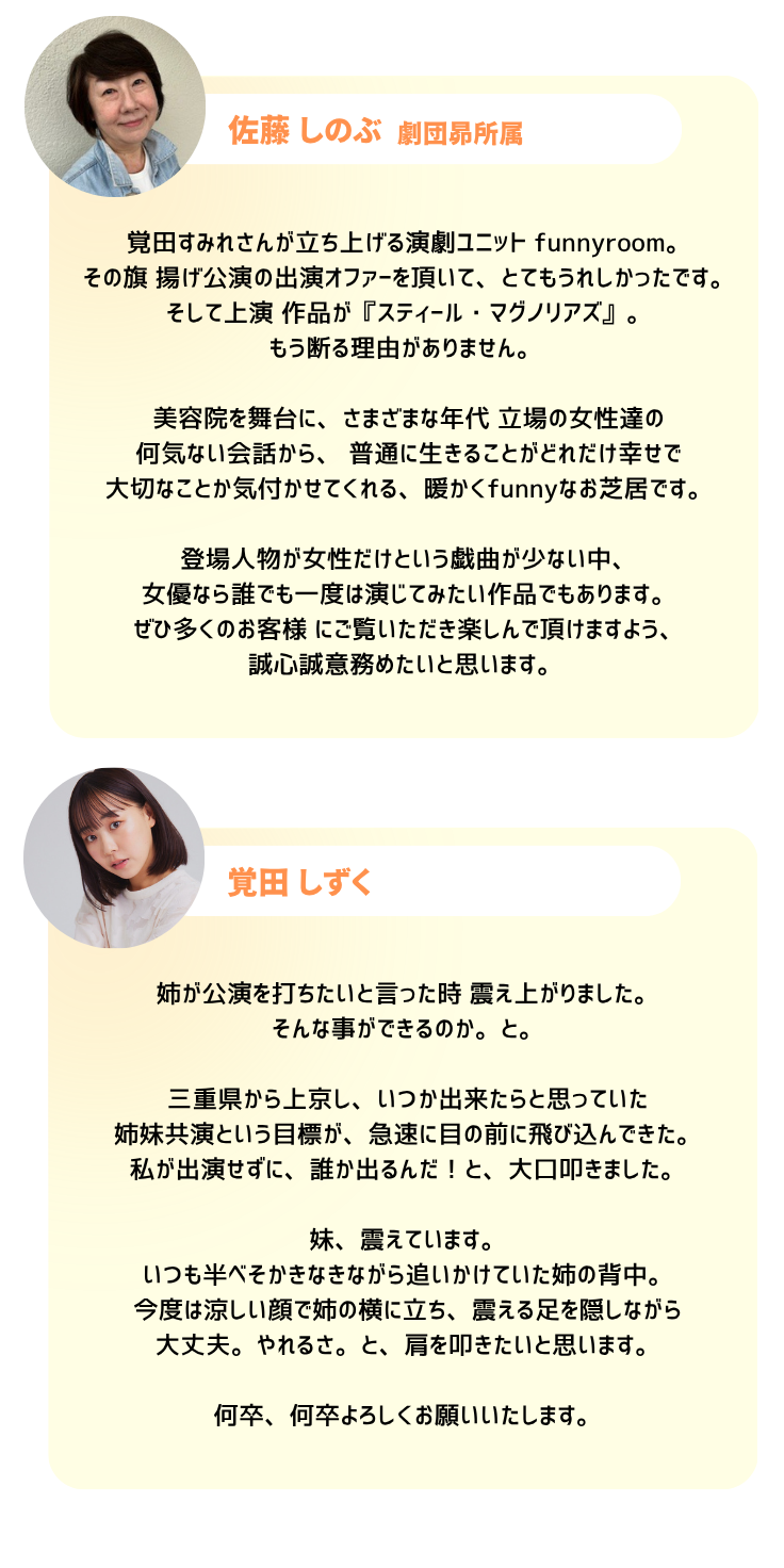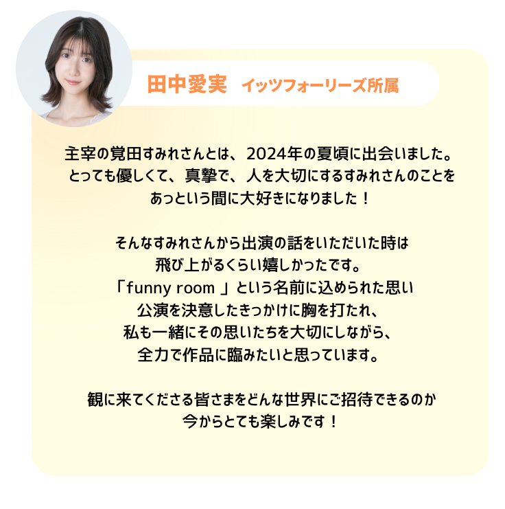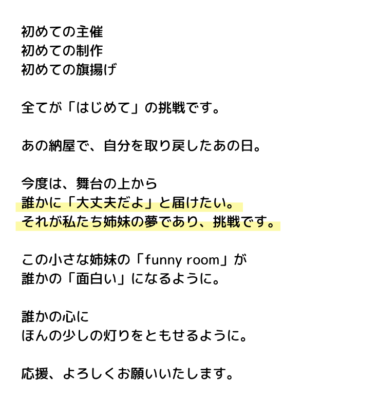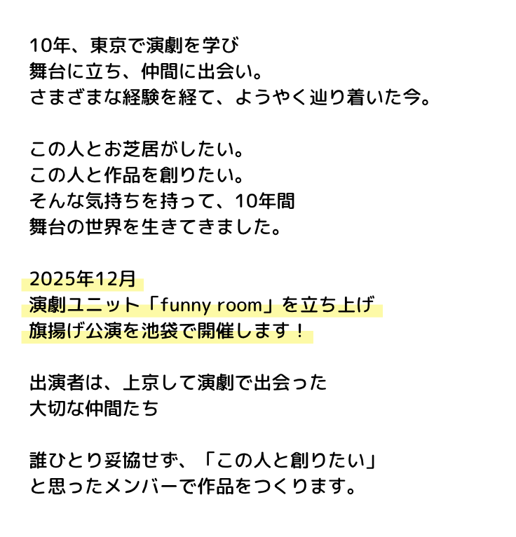 三重県から上京した姉妹の演劇ユニット『funny room』。2025年12月、旗揚げ公演決定!演劇を通じて、1人でも多くの人の「味方」であれるようなユニットを目指します。