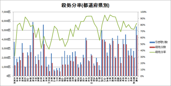 こうして出来た子猫は、いらない子として保健所へ持ち込まれたり、公園などに捨てられ野良猫となってしまいます。野良猫化した子猫は去勢・避妊をしていませんので、成猫になりまた子どもを作り、その子猫が捕獲され保健所に持ち込まれたりします。保健所に持ち込まれた猫のなかには飼い主に返還されたり、里親募集で譲渡されたりする猫もいますが、下のグラフが表している通り大半の猫は命の期限を決められ殺処分となってしまいます。