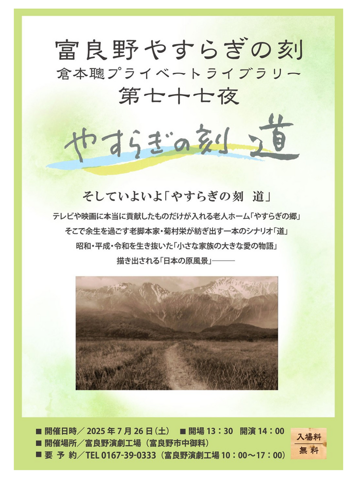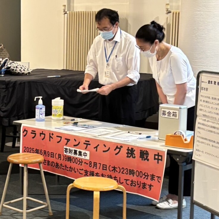 2025年7月26日に倉本聰先生のプライベートライブラリー 第七十七夜『やすらぎの刻 道』が富良野演劇工場で開催され、ホールにて当院の特設ブースを設置させていただきました。会場内でのアナウンスや倉本先生からも本プロジェクトの大切さを呼びかけてくださり多くのご支援をいただきました。