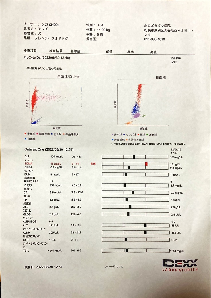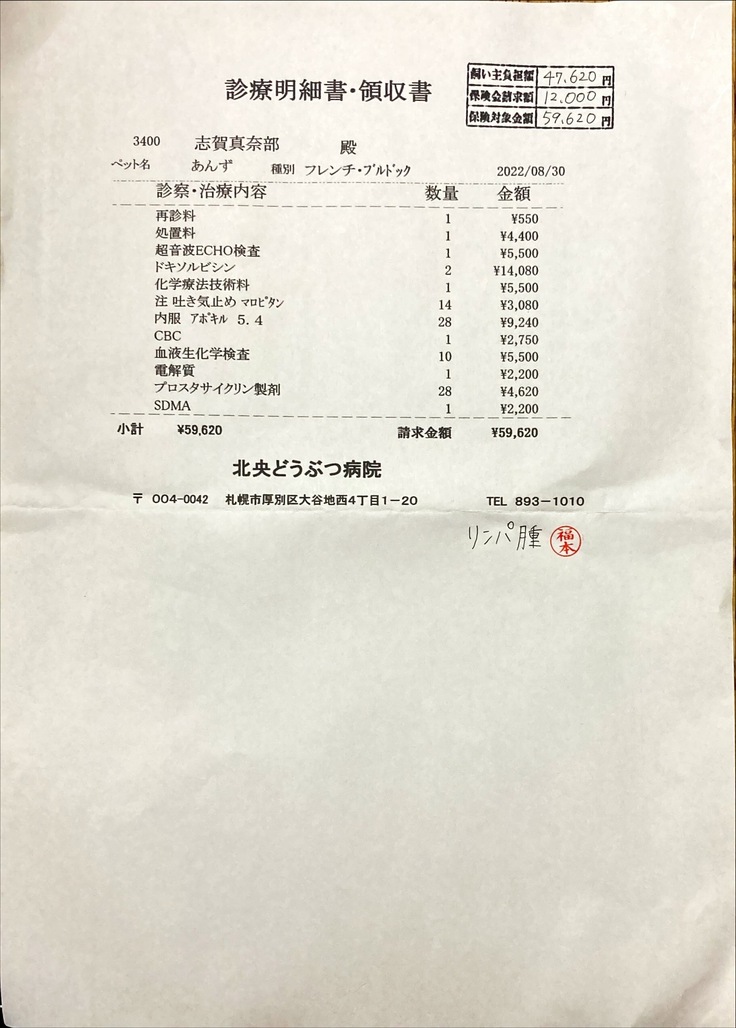 いつもの様に体温体重測定、触診、心音チェック、血液検査、エコー検査が行われ少し白血球数が少なかったらしいのですが、抗がん剤を打てないほど少なくないという事で、治療計画最後の抗がん剤が投与されました。