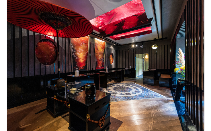 普段、美術館へおこしいただく装いでも、せっかくの機会なのでお着物をお召しになっても、桜の間の見所の一つである、田村能里子先生によって天井に描かれてた「季の嵐」の、天から舞い散る桜吹雪と、壁をつたい、見ている人に降り注ぐかのような空間の中では、皆様のどんな装いも素敵に見えること間違いありません。