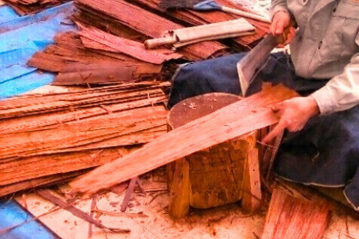 原皮師(もとかわし)と呼ばれる職人が、檜の外側の皮だけを採取して、その檜皮を屋根の厚さや大きさに合わせて仕立て、そうした下準備の後に、ようやく檜皮葺きの作業に取り掛かります。