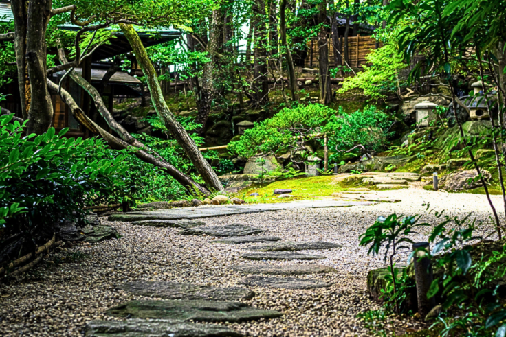 皆様がお座りになられた眼前には、ここまで歩みを進めてきたお庭の様子と、これから招き入れられる茶室「知足庵」の様子が広がっています。