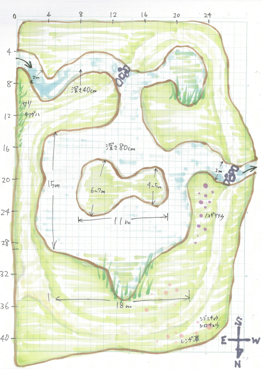 その後水路を掘り、ため池を作り、生き物が返ってくるのを待ちます。冬を越し来年の春には、生き物、植物の生態調査を行い、近辺で捕獲したメダカ等の生物を放ち、その後、定期的に経過を観察して行きます。周辺の環境と調和し、生き物がいっぱいのビオトープとなるのは数年かかると思います。