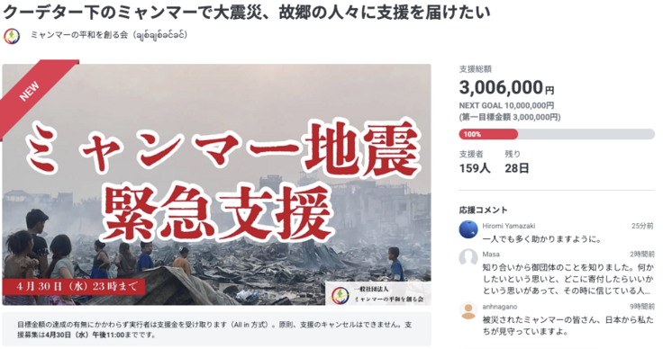 皆さまのおかげで本日、第一目標の300万円を達成することができました。温かいご支援、そして想いを寄せてくださったすべての方に、心より感謝申し上げます。