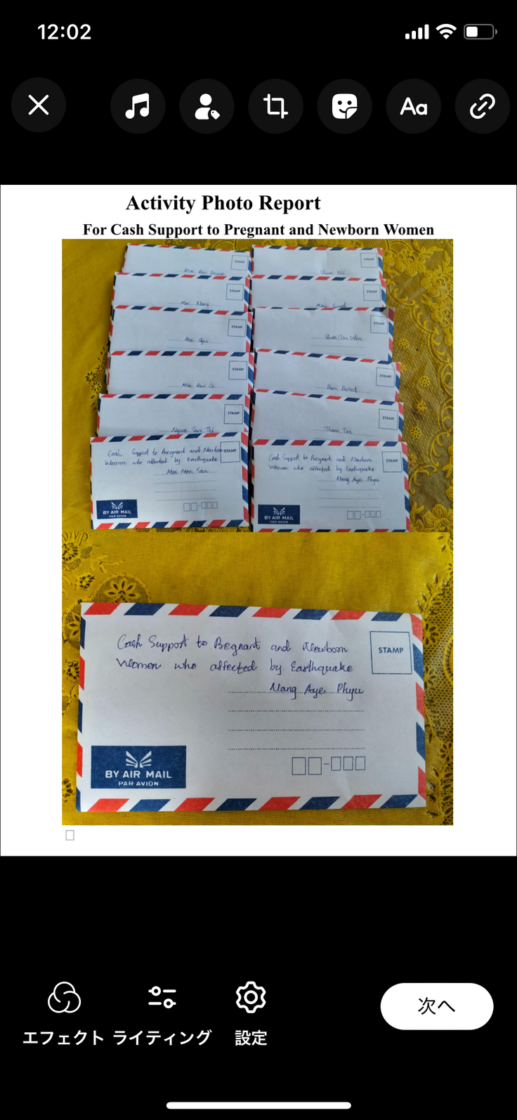 ・妊婦や出産直後のお母さん12名に対し現金寄付