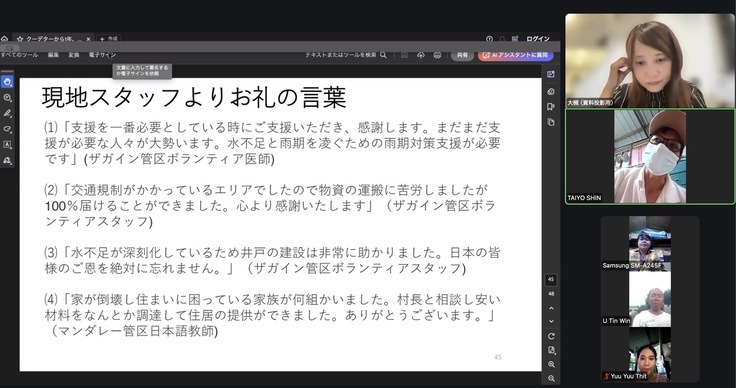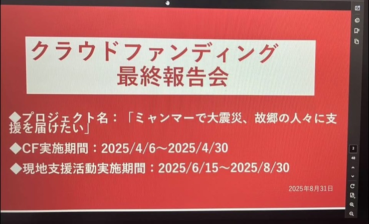 8月31日(日)、「一般社団法人ミャンマーの平和を創る会(チィチィキンキン)」は、ミャンマー地震被災者支援のためにREADYFORのサイトにて実施しましたクラウドファンディグ「ミャンマーで大震災、故郷の人々に支援を届けたい」プロジェクトのオンライン報告会を開催いたしました。