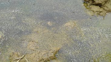 雨降りのあと、田んぼの水たまりにはカエルがたくさん産卵していました。